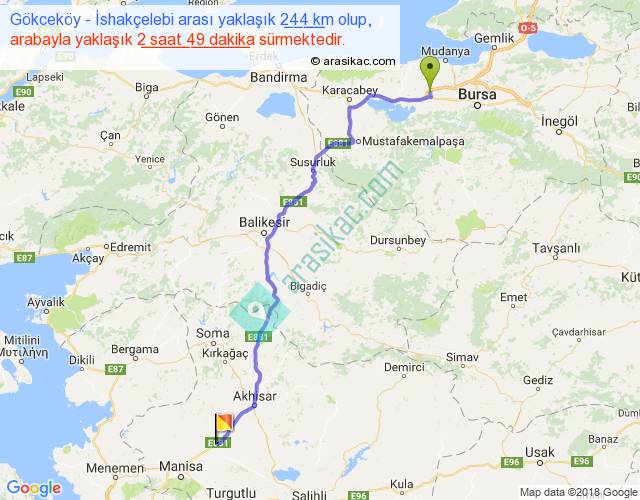 Gökceköy - İshakçelebi arası yaklaşık olarak 90 km/h ile yukarıda belirtilen sürede olup, iki yerin kuş uçuşu uzaklığı (mesafesi) 193'dir. Yolculuk otobüsle 3 saat 39 dakika sürmektedir.