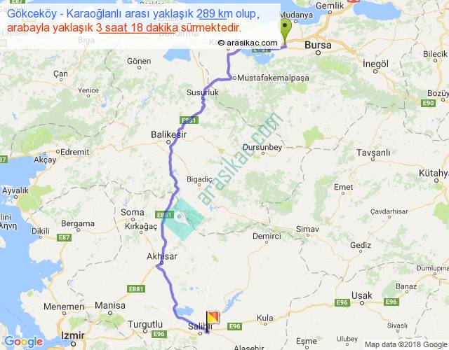 Gökceköy - Karaoğlanlı arası yaklaşık olarak 90 km/h ile yukarıda belirtilen sürede olup, iki yerin kuş uçuşu uzaklığı (mesafesi) 201'dir. Yolculuk otobüsle 4 saat 17 dakika sürmektedir.