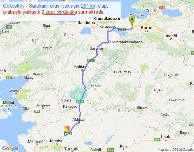 Gökceköy - Saruhanlı arası yaklaşık olarak 90 km/h ile yukarıda belirtilen sürede olup, iki yerin kuş uçuşu uzaklığı (mesafesi) 197'dir. Yolculuk otobüsle 3 saat 47 dakika sürmektedir.