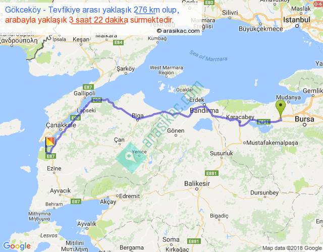 Gökceköy - Tevfikiye arası yaklaşık olarak 90 km/h ile yukarıda belirtilen sürede olup, iki yerin kuş uçuşu uzaklığı (mesafesi) 218'dir. Yolculuk otobüsle 4 saat 22 dakika sürmektedir.