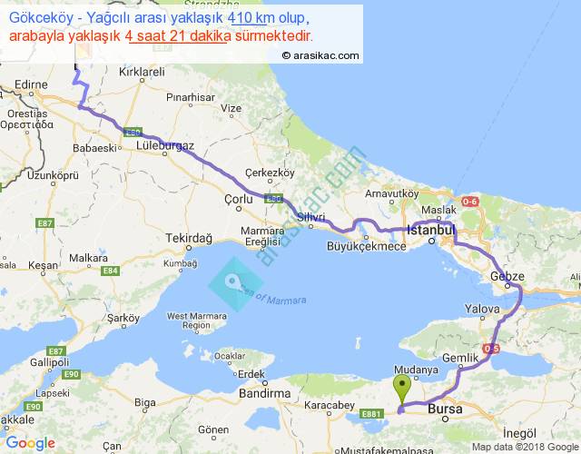 Gökceköy - Yağcılı arası yaklaşık olarak 90 km/h ile yukarıda belirtilen sürede olup, iki yerin kuş uçuşu uzaklığı (mesafesi) 237'dir. Yolculuk otobüsle 5 saat 39 dakika sürmektedir.
