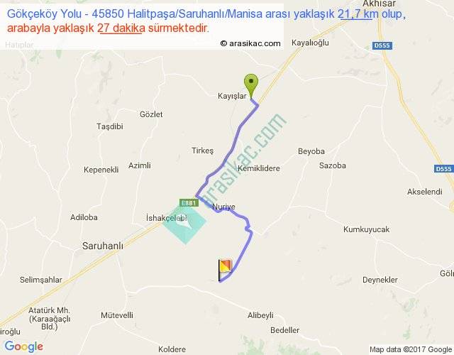 Gökçeköy Yolu - 45850 Halitpaşa Saruhanlı Manisa arası yaklaşık olarak 90 km/h ile yukarıda belirtilen sürede olup, iki yerin kuş uçuşu uzaklığı (mesafesi) 15'dir. Yolculuk otobüsle 35 dakika sürmektedir.