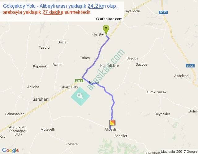 Gökçeköy Yolu - Alibeyli arası yaklaşık olarak 90 km/h ile yukarıda belirtilen sürede olup, iki yerin kuş uçuşu uzaklığı (mesafesi) 18'dir. Yolculuk otobüsle 35 dakika sürmektedir.