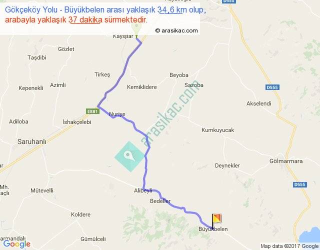 Gökçeköy Yolu - Büyükbelen arası yaklaşık olarak 90 km/h ile yukarıda belirtilen sürede olup, iki yerin kuş uçuşu uzaklığı (mesafesi) 24'dir. Yolculuk otobüsle 48 dakika sürmektedir.