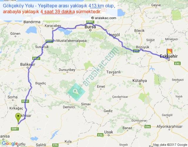 Gökçeköy Yolu - Yeşiltepe arası yaklaşık olarak 90 km/h ile yukarıda belirtilen sürede olup, iki yerin kuş uçuşu uzaklığı (mesafesi) 261'dir. Eğer belirtilen yerler arasında uçak seferi var ise bu süre uçakla 24 dakika'ya kadar düşebilir. Yolculuk otobüsle 6 saat 2 dakika sürmektedir.