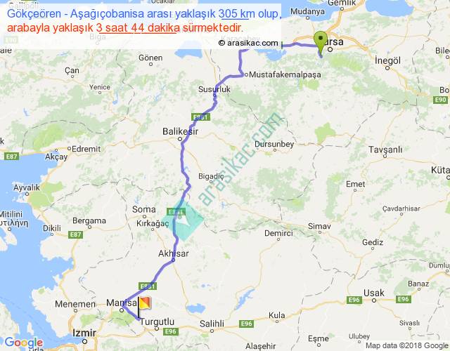 Gökçeören - Aşağıçobanisa arası yaklaşık olarak 90 km/h ile yukarıda belirtilen sürede olup, iki yerin kuş uçuşu uzaklığı (mesafesi) 213'dir. Yolculuk otobüsle 4 saat 51 dakika sürmektedir.