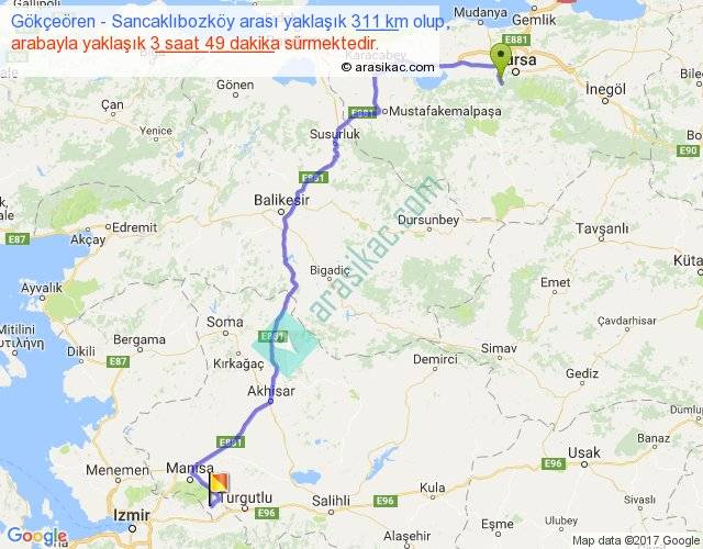 Gökçeören - Sancaklıbozköy arası yaklaşık olarak 90 km/h ile yukarıda belirtilen sürede olup, iki yerin kuş uçuşu uzaklığı (mesafesi) 219'dir. Yolculuk otobüsle 4 saat 57 dakika sürmektedir.