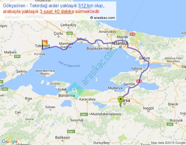 Gökçeören - Tekirdağ arası yaklaşık olarak 90 km/h ile yukarıda belirtilen sürede olup, iki yerin kuş uçuşu uzaklığı (mesafesi) 154'dir. Yolculuk otobüsle 4 saat 46 dakika sürmektedir.