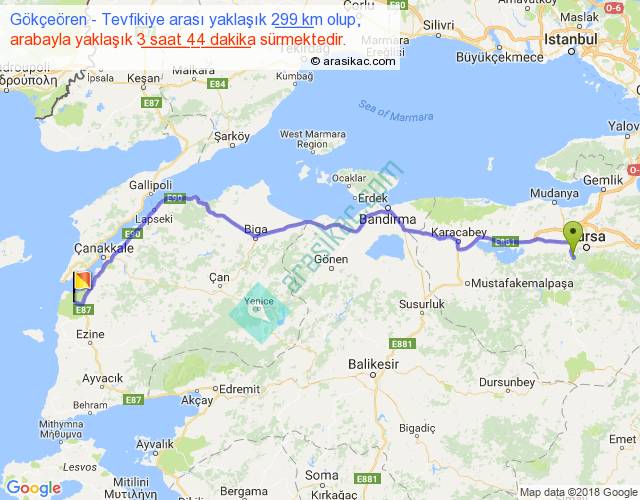 Gökçeören - Tevfikiye arası yaklaşık olarak 90 km/h ile yukarıda belirtilen sürede olup, iki yerin kuş uçuşu uzaklığı (mesafesi) 233'dir. Yolculuk otobüsle 4 saat 51 dakika sürmektedir.