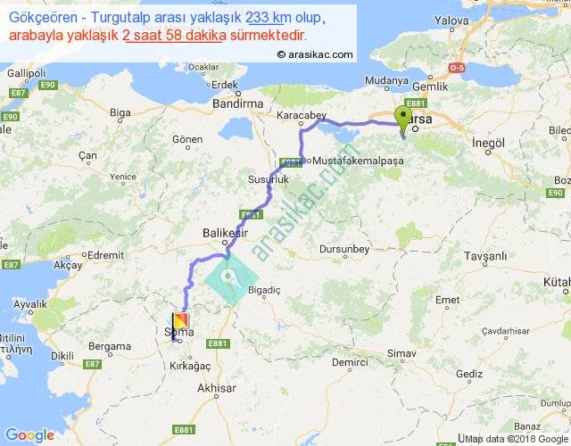 Gökçeören - Turgutalp arası yaklaşık olarak 90 km/h ile yukarıda belirtilen sürede olup, iki yerin kuş uçuşu uzaklığı (mesafesi) 160'dir. Yolculuk otobüsle 3 saat 51 dakika sürmektedir.