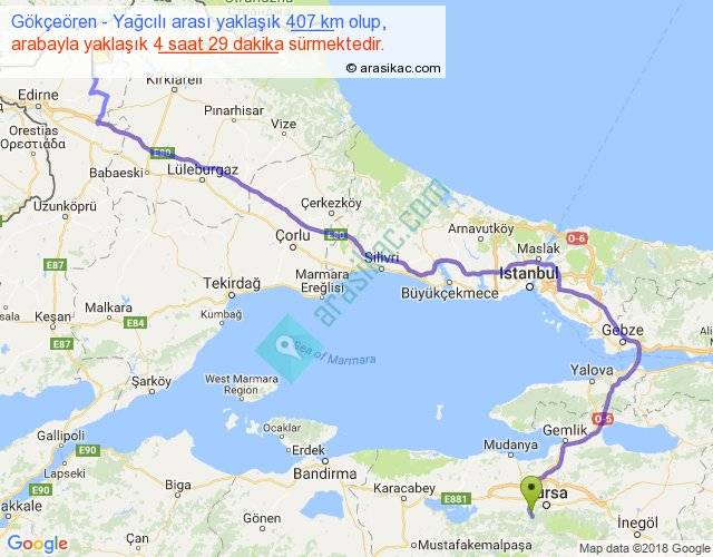 Gökçeören - Yağcılı arası yaklaşık olarak 90 km/h ile yukarıda belirtilen sürede olup, iki yerin kuş uçuşu uzaklığı (mesafesi) 255'dir. Eğer belirtilen yerler arasında uçak seferi var ise bu süre uçakla 23 dakika'ya kadar düşebilir. Yolculuk otobüsle 5 saat 49 dakika sürmektedir.