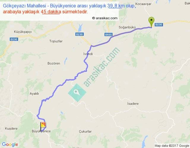 Gökçeyazı Mahallesi - Büyükyenice arası yaklaşık olarak 90 km/h ile yukarıda belirtilen sürede olup, iki yerin kuş uçuşu uzaklığı (mesafesi) 30'dir. Yolculuk otobüsle 58 dakika sürmektedir.