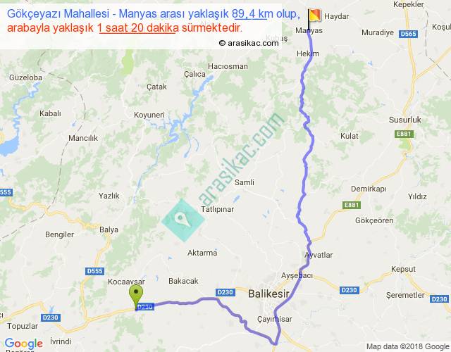 Gökçeyazı Mahallesi - Manyas arası yaklaşık olarak 90 km/h ile yukarıda belirtilen sürede olup, iki yerin kuş uçuşu uzaklığı (mesafesi) 54'dir. Yolculuk otobüsle 1 saat 44 dakika sürmektedir.