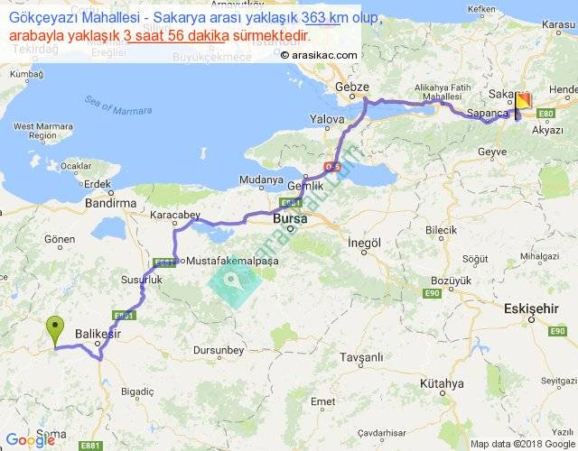 Gökçeyazı Mahallesi - Sakarya arası yaklaşık olarak 90 km/h ile yukarıda belirtilen sürede olup, iki yerin kuş uçuşu uzaklığı (mesafesi) 264'dir. Eğer belirtilen yerler arasında uçak seferi var ise bu süre uçakla 24 dakika'ya kadar düşebilir. Yolculuk otobüsle 5 saat 6 dakika sürmektedir.