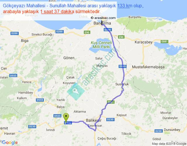 Gökçeyazı Mahallesi - Sunullah Mahallesi arası yaklaşık olarak 90 km/h ile yukarıda belirtilen sürede olup, iki yerin kuş uçuşu uzaklığı (mesafesi) 84'dir. Yolculuk otobüsle 2 saat 6 dakika sürmektedir.