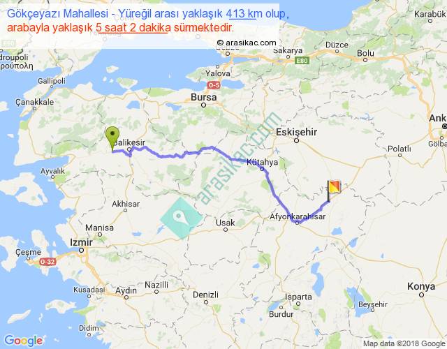 Gökçeyazı Mahallesi - Yüreğil arası yaklaşık olarak 90 km/h ile yukarıda belirtilen sürede olup, iki yerin kuş uçuşu uzaklığı (mesafesi) 298'dir. Eğer belirtilen yerler arasında uçak seferi var ise bu süre uçakla 27 dakika'ya kadar düşebilir. Yolculuk otobüsle 6 saat 32 dakika sürmektedir.