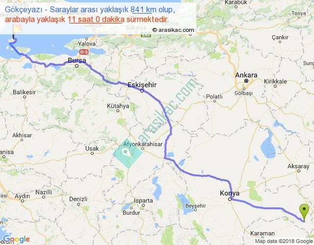 Gökçeyazı - Saraylar arası yaklaşık olarak 90 km/h ile yukarıda belirtilen sürede olup, iki yerin kuş uçuşu uzaklığı (mesafesi) 659'dir. Eğer belirtilen yerler arasında uçak seferi var ise bu süre uçakla 1 saat 00 dakika'ya kadar düşebilir. Yolculuk otobüsle 14 saat 18 dakika sürmektedir.