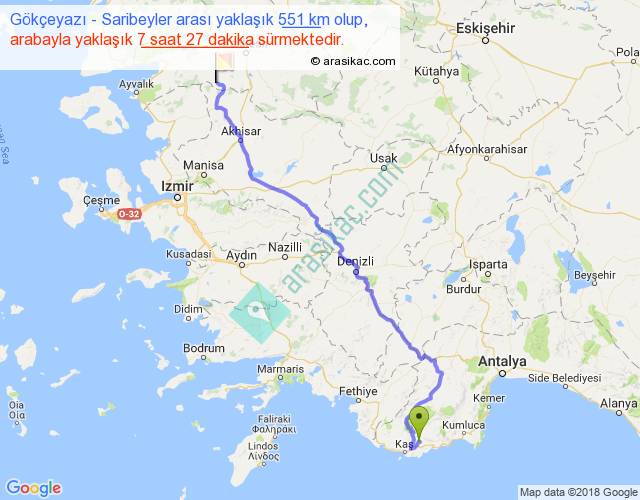 Gökçeyazı - Saribeyler arası yaklaşık olarak 90 km/h ile yukarıda belirtilen sürede olup, iki yerin kuş uçuşu uzaklığı (mesafesi) 395'dir. Eğer belirtilen yerler arasında uçak seferi var ise bu süre uçakla 36 dakika'ya kadar düşebilir. Yolculuk otobüsle 9 saat 41 dakika sürmektedir.