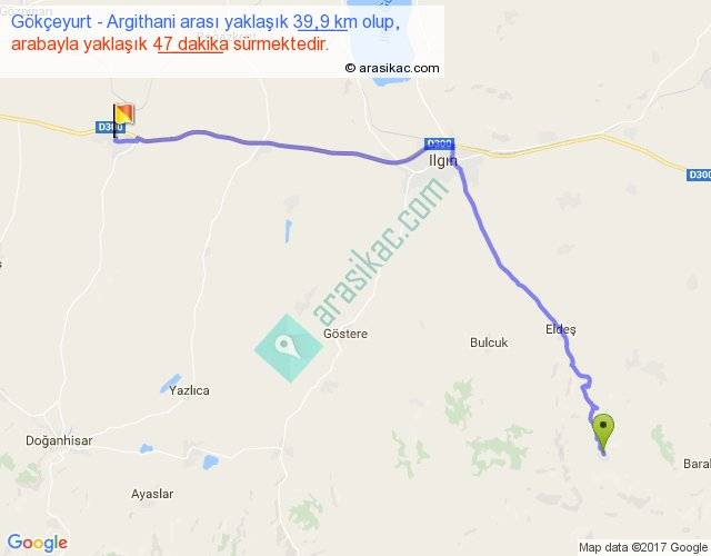 Gökçeyurt - Argithani arası yaklaşık olarak 90 km/h ile yukarıda belirtilen sürede olup, iki yerin kuş uçuşu uzaklığı (mesafesi) 31'dir. Yolculuk otobüsle 1 saat 1 dakika sürmektedir.