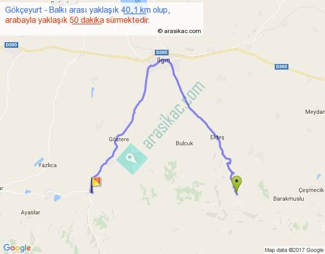 Gökçeyurt - Balkı arası yaklaşık olarak 90 km/h ile yukarıda belirtilen sürede olup, iki yerin kuş uçuşu uzaklığı (mesafesi) 17'dir. Yolculuk otobüsle 1 saat 5 dakika sürmektedir.