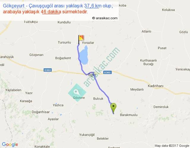 Gökçeyurt - Çavuşçugöl arası yaklaşık olarak 90 km/h ile yukarıda belirtilen sürede olup, iki yerin kuş uçuşu uzaklığı (mesafesi) 31'dir. Yolculuk otobüsle 59 dakika sürmektedir.