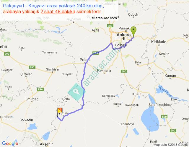 Gökçeyurt - Koçyazı arası yaklaşık olarak 90 km/h ile yukarıda belirtilen sürede olup, iki yerin kuş uçuşu uzaklığı (mesafesi) 175'dir. Yolculuk otobüsle 3 saat 38 dakika sürmektedir.