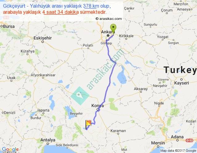 Gökçeyurt - Yalıhüyük arası yaklaşık olarak 90 km/h ile yukarıda belirtilen sürede olup, iki yerin kuş uçuşu uzaklığı (mesafesi) 304'dir. Eğer belirtilen yerler arasında uçak seferi var ise bu süre uçakla 28 dakika'ya kadar düşebilir. Yolculuk otobüsle 5 saat 56 dakika sürmektedir.