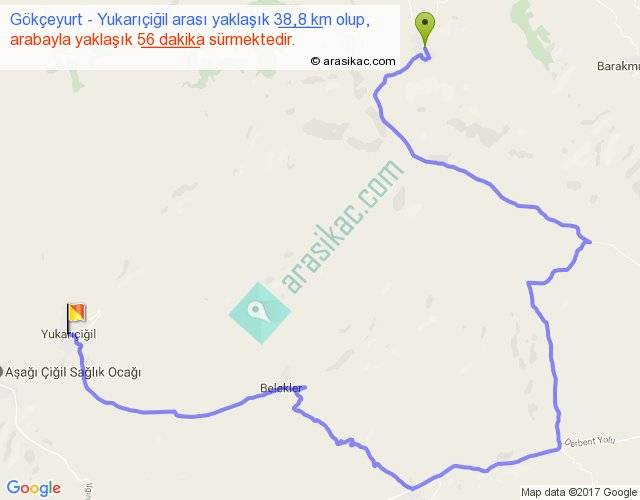 Gökçeyurt - Yukarıçiğil arası yaklaşık olarak 90 km/h ile yukarıda belirtilen sürede olup, iki yerin kuş uçuşu uzaklığı (mesafesi) 14'dir. Yolculuk otobüsle 1 saat 12 dakika sürmektedir.