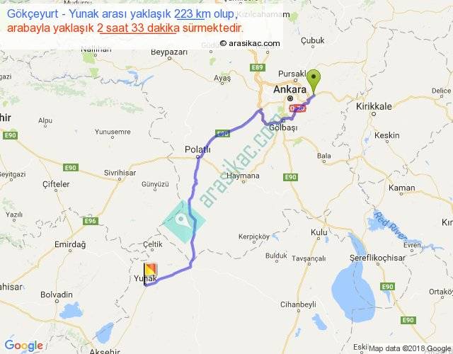 Gökçeyurt - Yunak arası yaklaşık olarak 90 km/h ile yukarıda belirtilen sürede olup, iki yerin kuş uçuşu uzaklığı (mesafesi) 168'dir. Yolculuk otobüsle 3 saat 18 dakika sürmektedir.