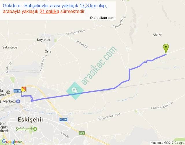 Gökdere - Bahçelievler arası yaklaşık olarak 90 km/h ile yukarıda belirtilen sürede olup, iki yerin kuş uçuşu uzaklığı (mesafesi) 15'dir. Yolculuk otobüsle 27 dakika sürmektedir.