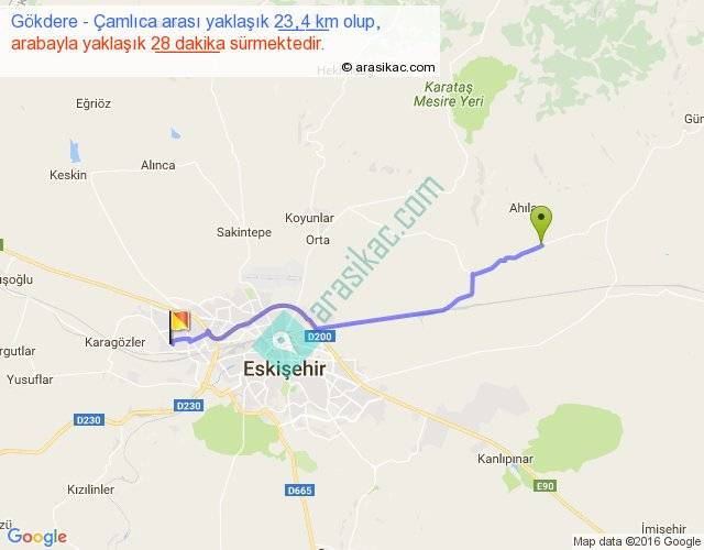 Gökdere - Çamlıca arası yaklaşık olarak 90 km/h ile yukarıda belirtilen sürede olup, iki yerin kuş uçuşu uzaklığı (mesafesi) 20'dir. Yolculuk otobüsle 36 dakika sürmektedir.