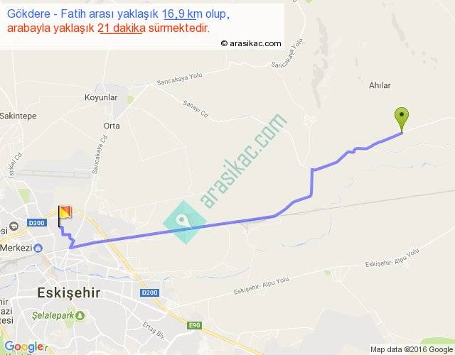 Gökdere - Fatih arası yaklaşık olarak 90 km/h ile yukarıda belirtilen sürede olup, iki yerin kuş uçuşu uzaklığı (mesafesi) 15'dir. Yolculuk otobüsle 27 dakika sürmektedir.