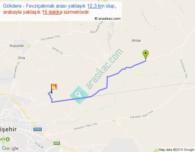 Gökdere - Fevziçakmak arası yaklaşık olarak 90 km/h ile yukarıda belirtilen sürede olup, iki yerin kuş uçuşu uzaklığı (mesafesi) 9'dir. Yolculuk otobüsle 19 dakika sürmektedir.