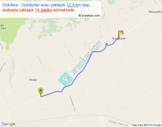 Gökdere - Gündüzler arası yaklaşık olarak 90 km/h ile yukarıda belirtilen sürede olup, iki yerin kuş uçuşu uzaklığı (mesafesi) 11'dir. Yolculuk otobüsle 18 dakika sürmektedir.