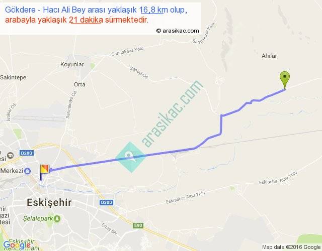 Gökdere - Hacı Ali Bey arası yaklaşık olarak 90 km/h ile yukarıda belirtilen sürede olup, iki yerin kuş uçuşu uzaklığı (mesafesi) 15'dir. Yolculuk otobüsle 27 dakika sürmektedir.