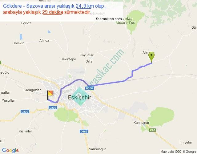 Gökdere - Sazova arası yaklaşık olarak 90 km/h ile yukarıda belirtilen sürede olup, iki yerin kuş uçuşu uzaklığı (mesafesi) 21'dir. Yolculuk otobüsle 37 dakika sürmektedir.