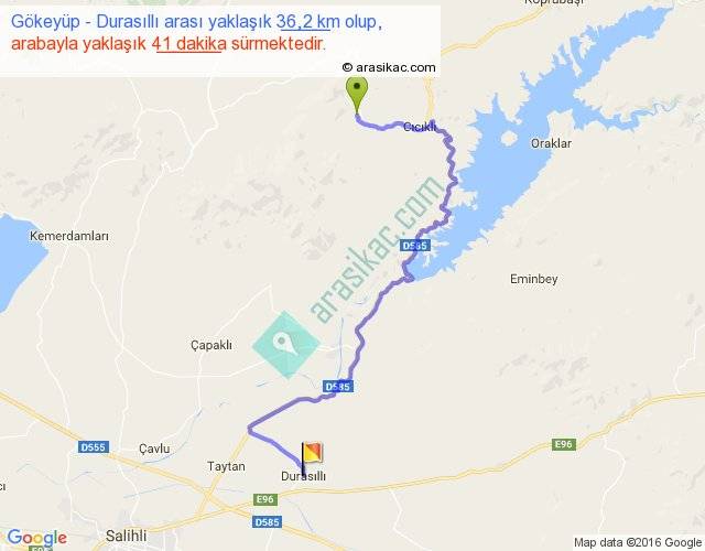 Gökeyüp - Durasıllı arası yaklaşık olarak 90 km/h ile yukarıda belirtilen sürede olup, iki yerin kuş uçuşu uzaklığı (mesafesi) 20'dir. Yolculuk otobüsle 53 dakika sürmektedir.