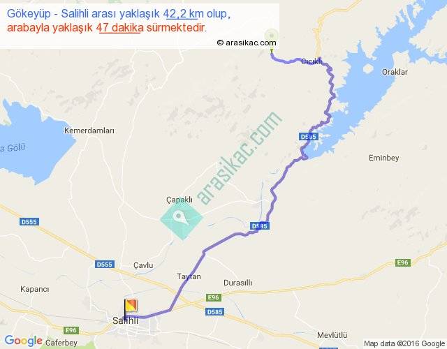 Gökeyüp - Salihli arası yaklaşık olarak 90 km/h ile yukarıda belirtilen sürede olup, iki yerin kuş uçuşu uzaklığı (mesafesi) 26'dir. Yolculuk otobüsle 1 saat 1 dakika sürmektedir.