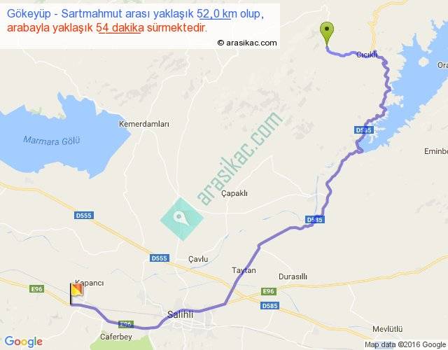 Gökeyüp - Sartmahmut arası yaklaşık olarak 90 km/h ile yukarıda belirtilen sürede olup, iki yerin kuş uçuşu uzaklığı (mesafesi) 31'dir. Yolculuk otobüsle 1 saat 10 dakika sürmektedir.