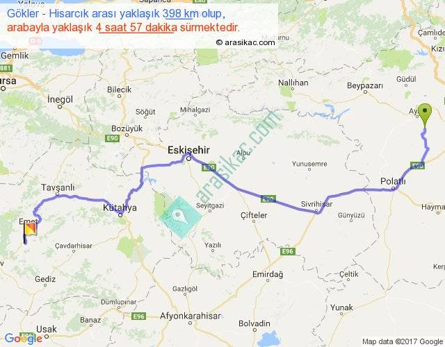 Gökler - Hisarcık arası yaklaşık olarak 90 km/h ile yukarıda belirtilen sürede olup, iki yerin kuş uçuşu uzaklığı (mesafesi) 280'dir. Eğer belirtilen yerler arasında uçak seferi var ise bu süre uçakla 25 dakika'ya kadar düşebilir. Yolculuk otobüsle 6 saat 26 dakika sürmektedir.