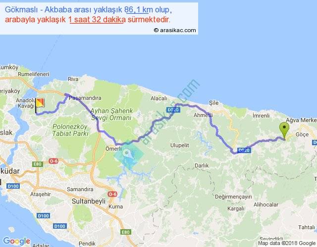 Gökmaslı - Akbaba arası yaklaşık olarak 90 km/h ile yukarıda belirtilen sürede olup, iki yerin kuş uçuşu uzaklığı (mesafesi) 58'dir. Yolculuk otobüsle 1 saat 59 dakika sürmektedir.