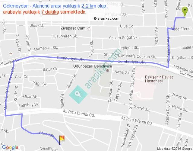 Gökmeydan - Alanönü arası yaklaşık olarak 90 km/h ile yukarıda belirtilen sürede olup, iki yerin kuş uçuşu uzaklığı (mesafesi) 1'dir. Yolculuk otobüsle 9 dakika sürmektedir.
