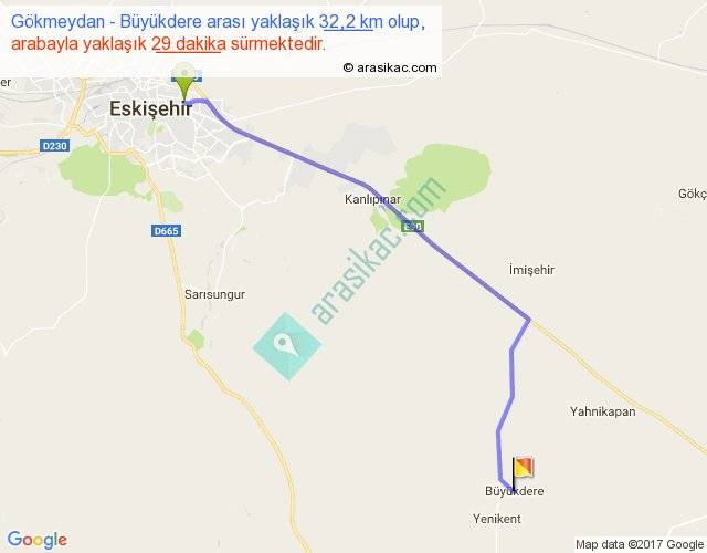 Gökmeydan - Büyükdere arası yaklaşık olarak 90 km/h ile yukarıda belirtilen sürede olup, iki yerin kuş uçuşu uzaklığı (mesafesi) 27'dir. Yolculuk otobüsle 37 dakika sürmektedir.