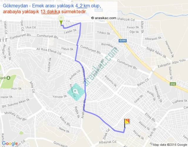 Gökmeydan - Emek arası yaklaşık olarak 90 km/h ile yukarıda belirtilen sürede olup, iki yerin kuş uçuşu uzaklığı (mesafesi) 3'dir. Yolculuk otobüsle 16 dakika sürmektedir.