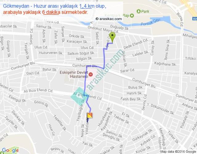 Gökmeydan - Huzur arası yaklaşık olarak 90 km/h ile yukarıda belirtilen sürede olup, iki yerin kuş uçuşu uzaklığı (mesafesi) 1'dir. Yolculuk otobüsle 7 dakika sürmektedir.