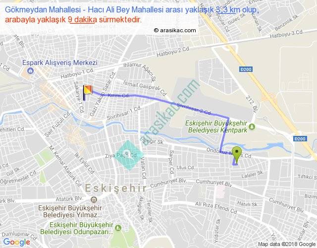 Gökmeydan Mahallesi - Hacı Ali Bey Mahallesi arası yaklaşık olarak 90 km/h ile yukarıda belirtilen sürede olup, iki yerin kuş uçuşu uzaklığı (mesafesi) 2'dir. Yolculuk otobüsle 11 dakika sürmektedir.