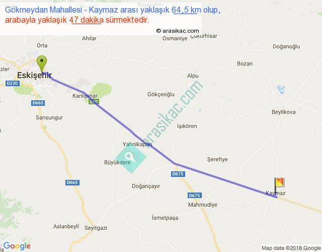 Gökmeydan Mahallesi - Kaymaz arası yaklaşık olarak 90 km/h ile yukarıda belirtilen sürede olup, iki yerin kuş uçuşu uzaklığı (mesafesi) 61'dir. Yolculuk otobüsle 1 saat 1 dakika sürmektedir.