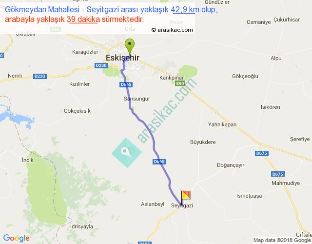 Gökmeydan Mahallesi - Seyitgazi arası yaklaşık olarak 90 km/h ile yukarıda belirtilen sürede olup, iki yerin kuş uçuşu uzaklığı (mesafesi) 38'dir. Yolculuk otobüsle 50 dakika sürmektedir.