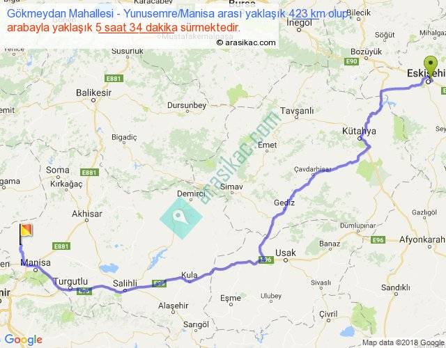 Gökmeydan Mahallesi - Yunusemre Manisa arası yaklaşık olarak 90 km/h ile yukarıda belirtilen sürede olup, iki yerin kuş uçuşu uzaklığı (mesafesi) 298'dir. Eğer belirtilen yerler arasında uçak seferi var ise bu süre uçakla 27 dakika'ya kadar düşebilir. Yolculuk otobüsle 7 saat 14 dakika sürmektedir.