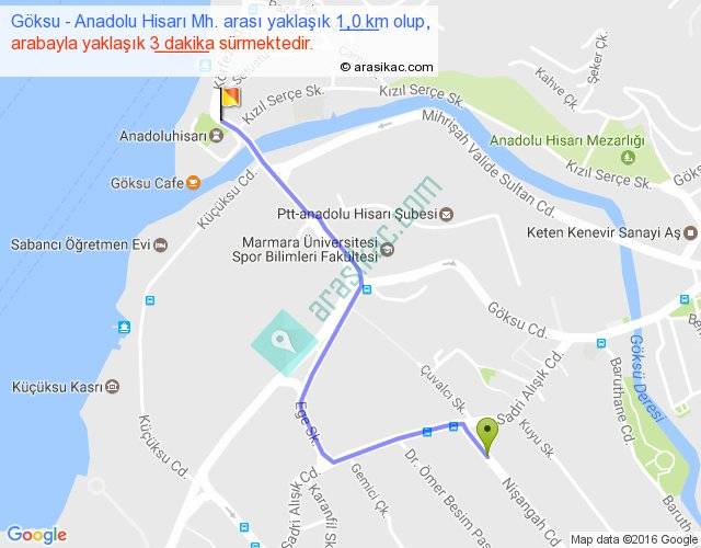 Eğer Göksu Anadolu Hisarı Mh. arası ne kadar yakar (benzin/mazot) diyorsanız, kilometrede 3 ₺ yakan bir aracınız var ise 3, km'de 4 ₺ yakan bir aracınız var ise 4, km'de 5 ₺ yakan bir aracınız var ise 5 ile bu yolculuğu tamamlayabilirsiniz.